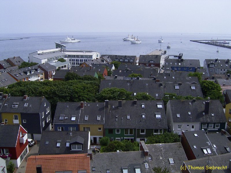Blick über die Dächer der Häuser vom Unterland auf die vor Anker liegenden Schiffe