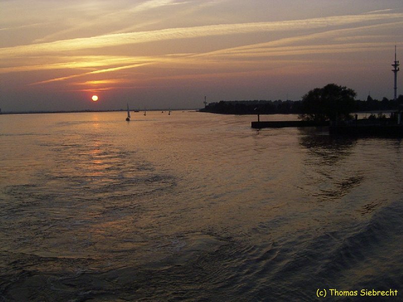 Ein Blick vom Heck des Katamaran über die Elbe in die untergehende Sonne